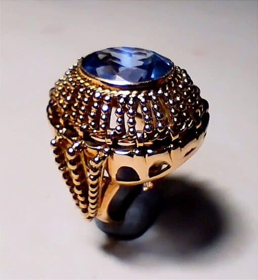 A 14karátos arany gyűrű aqvamarin drágakővel ékesített.A granuláció a tenger hullámai.
